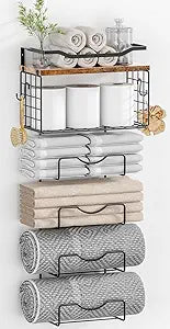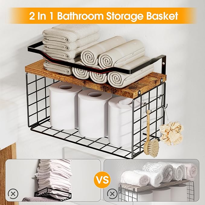 - Large Capacity - Bathroom floating shlefes with wire basket is easy to store all kinds of aroma, greens, candle cups, rolling papers, towels, the metal and wood combined makes bathroom towel holder more deco. Use separately from the towel rack.